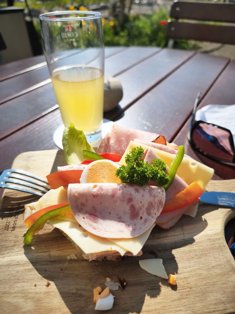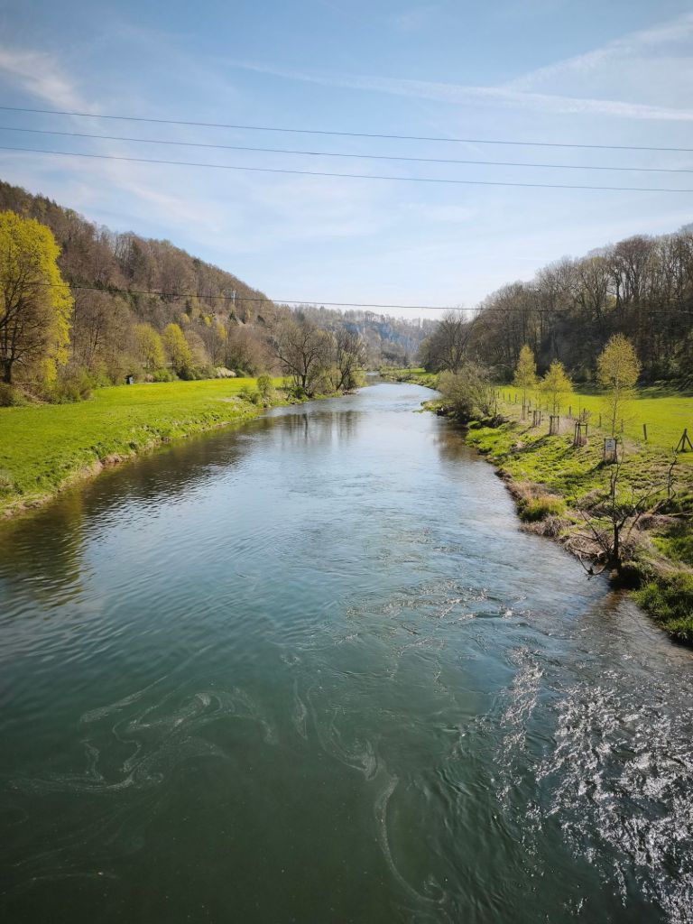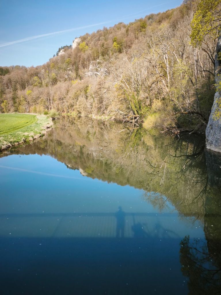 Zum Glück habe ich meine Motorradhandschuhe eingepackt. Der Weg führt durch Wälder, über unzählige Brücken, vorbei an Äckern und Auen, meist direkt entlang der noch jungen Donau. Ich passiere eine Eselsfarm, ein Rehgehege und einige Mühlen. In einer davon kehre ich ein und nehme, was es um diese Uhrzeit schon oder noch gibt: ein belegtes Brot. Dazu kommen zwei Äpfel vom Markt in Sigmaringen mit seiner imposanten Hohenzollern-Schlossanlage – vorerst meine Ration für den Tag.