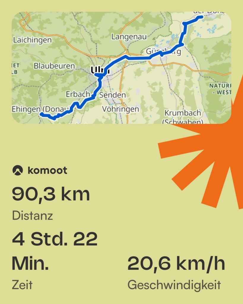 Trotz Elektrounterstützung habe ich bereits am ersten Tag meine Grenzen ausgetestet. Etwa 20 Kilometer vor Ehingen war ich kurz davor, die erste große Etappe abzubrechen – doch „when the going gets tough, the tough get going“. 😉