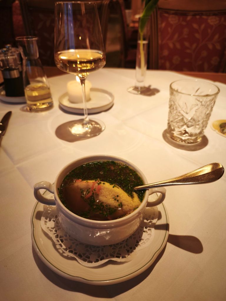Kraftbrühe mit Grießknödel und 1/4 Sauvignon Blanc